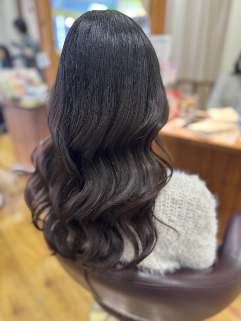 毛先にかけてゆるやかなウェーブをつけ、動きは出しつつも広がりすぎないように仕上げています。