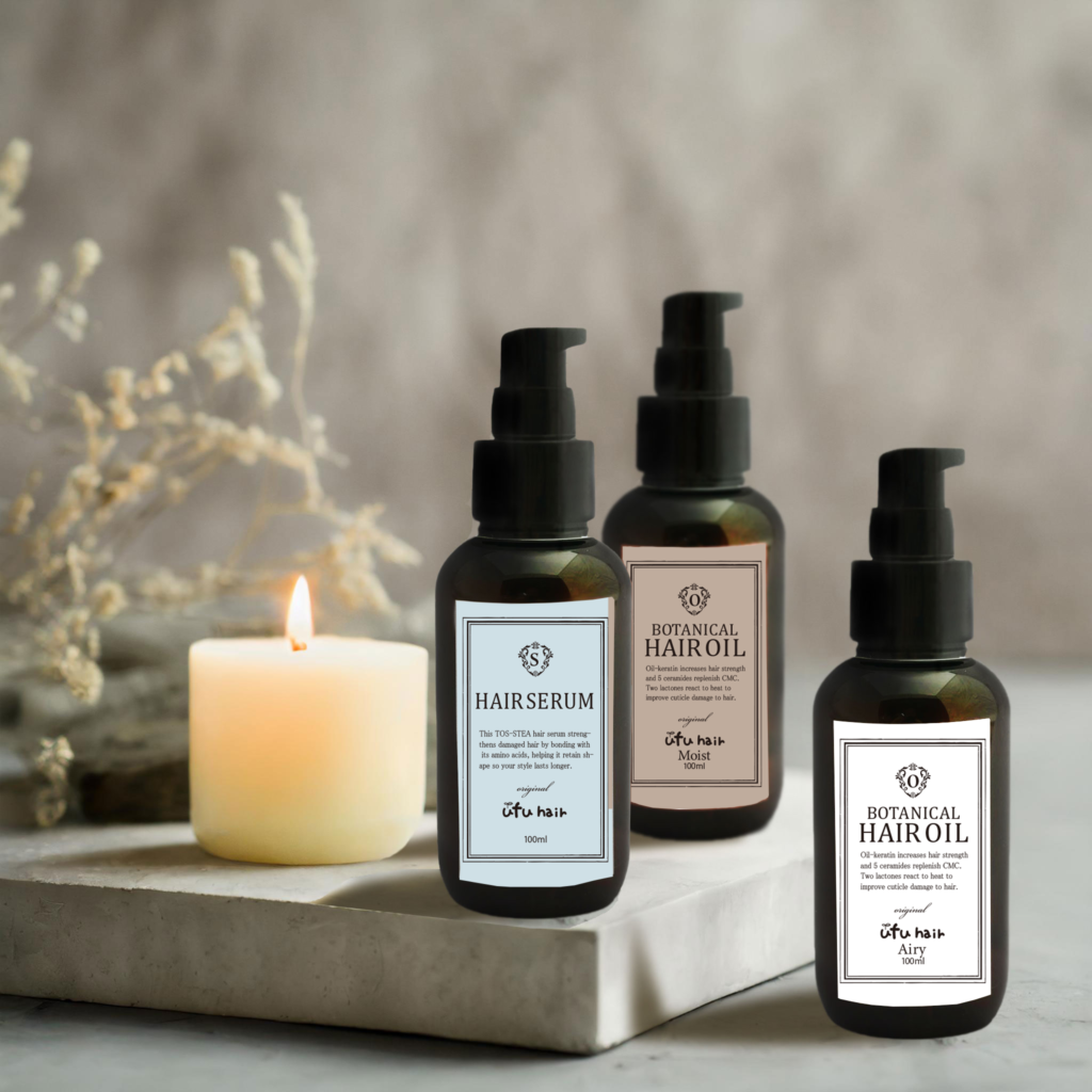 どちらのタイプも、毎日のドライヤー・アイロンの熱によるダメージから髪を守るため、熱を味方に髪を補修する成分を配合しています。ボタニカルオイルの種類を変えることで、仕上がりの質感を調整。オイルケラチン配合で、髪にうるおいを与え、健やかに保ちます。-